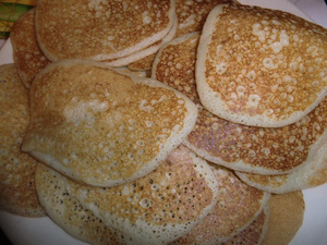 оладушки не жареные, на сыворотке, тесто как на блины чуть гуще, на антипригарной икеевской блинной сковороде ..... пекла блины, навела много теста, убрала в хол-к на след.день прибавила муки и оладушек напекла....темные т.к. на муке 1с+житница