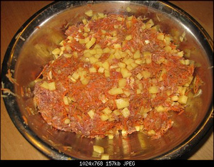Растапливаем масло, лучше, конечно, топленое. Кидаем лук, пассируем до прозрачного. В это время добавляем в фарш чеснок,овощи, все хорошенько перемешиваем и оставляем, чтобы мяско набрало соки со всех ингредиентов.