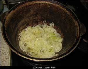 Все подготовили, достаем казан. У нас казан из литого алюминия, повидавший виды, перенсший и костер и плиту, и кучу переездов. Почему не чугунный? Да не знаю, привыкли мы к этому. Кстати, лучше русский литой алюминий, чем китайский чугун, от китайца запах идет не очень приятный, да и пища в нем невкусная, но это лично мое мнение, да и наших покупателей тоже.