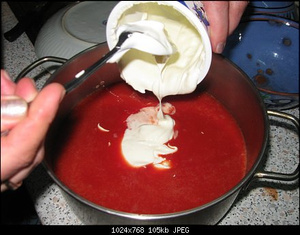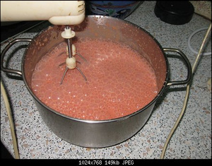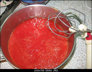 На следующем этапе добавляем воду, совсем немного, чтобы только скрыло продукты, кипятим еще минут 10, в это время берем томатный сок и добавляем туда сметану, все взбиваем миксером. Сока ушло чуть меньше, чем 3 литра.