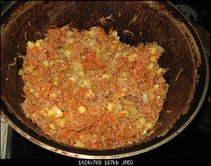 Обычно я беру ее на том же Центральном рынке у специальных азиатов, торгующих специями и приправами. Просишь набрать "на шурпу" и он наберет в пакетик 7 - 10 ингредиентов. Обязательно в составе должны быть сушеные помидоры, пажитник, паприка, жгучий красный перец, сушеный чеснок, молотый кумин. Остальное - на вкус товарища с Востока. Приправы в шурпе должно быть много!!!! На семилитровый казан я использую 3 - 4 столовых ложки смеси с горкой. Мясо в казане заливаю водой - и на большой огонь для скорого закипания. Очень тщательно снимать пену! Не один раз, а до закипания практически постоянно, и после закипания - каждые 5 - 10 минут. После закипания огонь делаем совсе слабым, чтобы только-только кипело. Примерно через час добавляю сразу всю приправу, после этого прекращаю снимать пену. Солю, должно быть чуть-чуть пересолено, поскольку нам еще добавлять овощи. Можно добавить одну луковицу целиком, не чищенную. После того, как она разварится - удалить. Мясо в общей сложности должно вариться 2 - 3 часа в зависимости от старости исходного барана, критерий готовности - легко отстает от костей. Кстати, когда готовлю шурпу дома, то на этом этапе достаю мясо и, отделив кости, выбрасываю их. Мясо возвращаю в казан. На природе таким не заморачиваюсь. Далее идет репа (редька), ее я режу крупными ломтями. Минут через 20-30 в казан летит крупно порезанная картошка и морковь толстыми кругляшами или полукругляшами. Не бойтесь переварить картошку - в присутствии помидор из приправы она не разварится. Еще минут через 20 - крупно порезанный болгарский перец. И минут через пятнадцать снимаю казан с огня. По истечении 3 минут после окончания кипения засыпаю порезанный полукольцами лук (это - на любителя, я люблю, когда лук похрустывает). 15 минут настаивания/остывания - можно разливать/раскладывать.