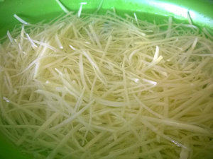 Картофель натереть на терке для корейской моркови или нарезать тоненькими брусочками (у кого под что руки заточены), промыть в проточной воде и залить холодной водой до использования.