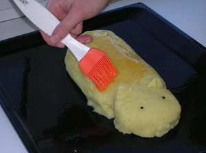 8. Спинку поросенка смазывает взбитым желтком. Глаза можно смастерить из перца горошком, можно пару сосисочных кружков использовать - в-общем, тут фантазии предела нет.
