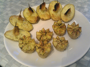 Фигурный обсыпаем травками типа "итальянские" и маслом оливковым. в Мужеские половинки фтыкаем кусочек сальца на зубочистке. Масло не обязтельно, сало будет обтекать картофан и предохранит от обгарания.