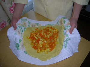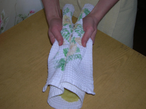 6. Берем края полотенчика с двух сторон и смыкаем края картофельного блина. Если что-то не склеилось, дорабатываем руками - делаем этакую картофельную "куколку".