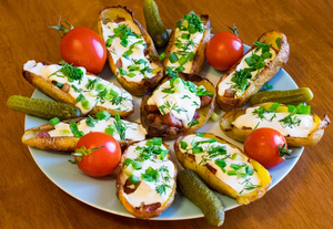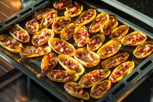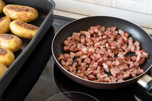 Вынимаем шкурки из духовки, посыпаем тёртым сыром, сверху добавляем кубики грудинки и отправляем в духовку в третий, последний раз. Минут 5 хватит, главное, чтобы сыр как следует расплавился.