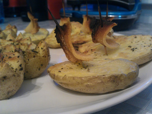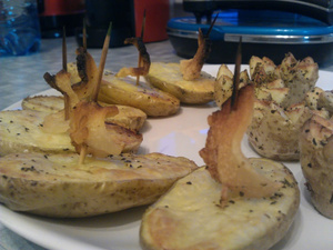Ставим под гриль/духовку на минут 20-30, тут у кого что на кухне. Достаем, жрем. Че еще с картофаном делать.