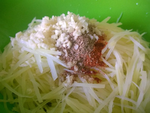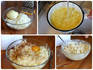 4 средних картофелины натереть на крупной терке и обильно промыть в холодной воде. Дать воде стечь.