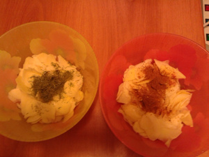Вынув уже готовые шкурки, кладём в каждую сверху ложку сметаны (я купил в Добрянке добротную, домашнюю с нежным сливочным вкусом, кому всё это покажется жирным, тот может ограничиться обычной сметаной, в этом есть свой плюс – добавляет немного кислинки, но мне талию беречь ни к чему) и посыпаем порезанным зелёным лучком и укропом.