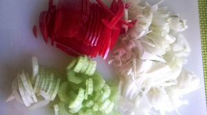 Параллельно этому порей (или репчатый лук) нарезаем кольцами (репчатый - четверть кольцами), помидоры (болгарский перец) - полосками, шампиньоны - пополам и каждую ломтиками поперек и обжариваем овощи с грибами в растительном масле около трех минут, добавив чеснок.