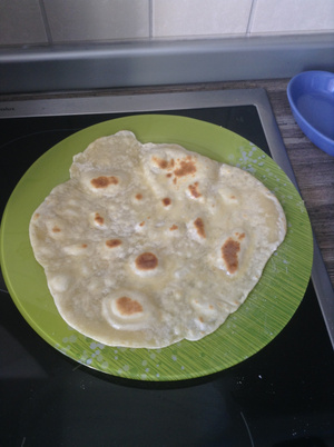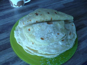Раскатанную лепешку надо жарить на сухой сковороде, постоянно переворачивая, затем снять и смазать маслом, а параллельно я не успевала раскатывать следующую лепешку. Поэтому у меня появилась помощница