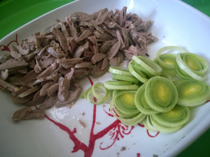 Сердечки нарезать соломкой и обжарить с луком в течении минут 5 на сильном огне. Цель - что бы лук слегка размягчился, а из мяса ушла лишняя жидкость.