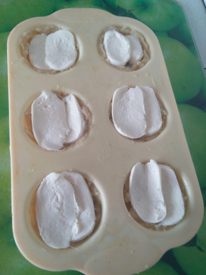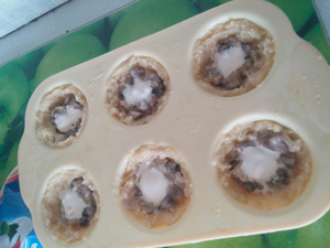 Я взяла силиконовую форму для кексов. Распределила пюре. В получившиеся корзинки добавила ложку грибов + чайную ложку домашних сливок.
