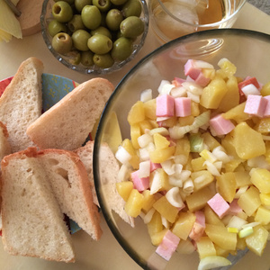 Собственно, некогда на этой неделе заморачиваться было:) Но нельзя же не поучаствовать! Поэтому - простой картофельный салат. Рецепт тоже простой до неприличия: картофель отварить в мундире - надо брать неразваривающийся. Пока варится, нарезать лук кубиками и замариновать его в смеси масла и уксуса, добавить чуть сахара. Потом картофель нарезать кубиками, ветчину - или что там у вас есть - тоже кубиками. Можно еще огурчик маринованный добавить, но у нас не было, да и не заморачивались. Все смешать, добавить соль и горчицу с зернами которая по вкусу, добавить заливку из масла и чеснока, можно есть чуть теплый, можно охладить, вечерний пятничный ужин готов.