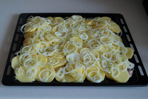 Картофель нарезать тоненькими ломтиками, я применила овощечистку.