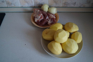 Мясо, мякоть. Лучше свинина, но можно и говядину, и куриное филе. Картофель. Лук репчатый. Майонез. Пропорции какие захотите.