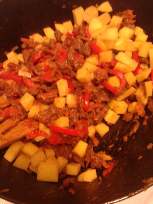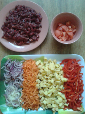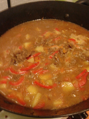 Ну и таки сбила одна девушка меня с пути, т.к. с утра были одни планы на готовку, а тут….в результате колбаски аккуратно уложены в морозилку, куплен перец, помидоры и молодой картофель и! гуляш, венгерский гуляш, т.е. очень густой суп или как мой сын говорит «второе с жижкой»