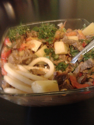 Вариантов готовки нашла массу: и с капустой, и баклажанами, и дайконом....остановилась на самом простом варианте. С лапшой возиться небыло времени, настоящая лапша домашняя и не нарезается, а готовится методом раскатывания и растягивания. Вариант который я выбрала называется лагман по-уйгурски.