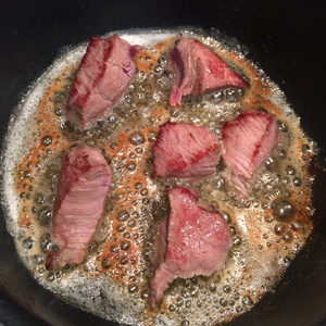 В кастрюле с толстым дном разогреваем сливочное масло. Мясо режем на кубики произвольно. Обжариваем. Запечатываем как стейк со всех сторон. Не надо много кусочков класть сразу, они дадут сок. Лучше порциями и тщательно и нежно, до золотистой корочки.