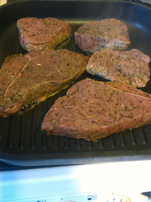 Дальше, как у всех. На горячууую сковродку без масла кидаем мясо, и нежно тыкаем лопаточкой, пока оно не сдвигается с места - рано переворачивать, как только заерзало - пора. И так три раза переворачиваю.