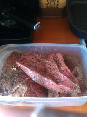Никогда не понимал мариновки, но с нашим мясом приходится. Посему травки типа "прованские", лимон с цедрой, соль сразу!, перец, оливковое маслице капельку. Все ведь в курсе ,что травки раскрываются в маслице. На пару часов.