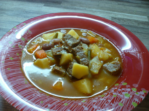 В чугунке (казан, утятница, сотейник) разогреваем подсолнечное масло и в разогретое масло бросаем мясо порезанное кубиками 5х5 см (температура высокая, т.е. «запечатываем» мясо), примерно 5 минут, далее температуру убавляем «чтоб чуть булькало» и тушим около 30 минут, добавляем репчатый лук и морковь, закрываем крышкой и тушим примерно 1 час , далее добавляем томаты (в нашем случае они пластмассовые и мы добавляем пару ложе томатной пасты) и тушим ещё минут 15, просыпаем 1 чайная ложка зиры, 1-2 чайная ложка барбариса, 2 чайных ложки молотой паприки, розмарин сухой – 2-3 щепотки, соль, перемешиваем и под крышкой минут 5-7 (в этот же момент по идее добавляют вино), далее добавляем очень крупно порезанный картофель (иногда картошку режем всего пополам), перемешиваем, если бульона мало, то добавляем воду (поскольку я не добавляла вино, то вода понадобилась), бульон должен на палец прикрывать блюдо, закрываем крышку и дотушиваем примерно минут 30-40. Общее время приготовления занимает порядка 2,5-3 часов, но это того стоит