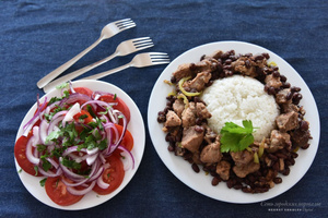 Обед: Мясо с фасолью, рис и салат из свежих помидоров