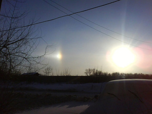 Гало вчера на мобильник сфотографировала. Солнце прыгало и сверкало, во все стороны полыхало цветами радуги.