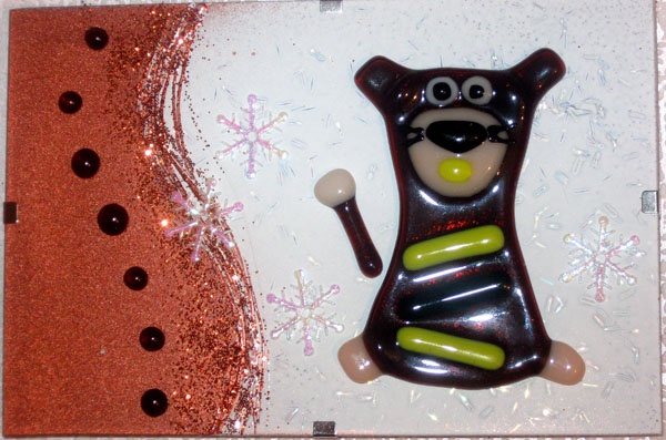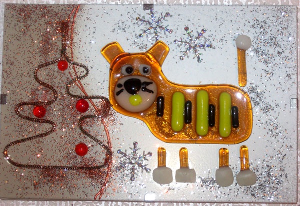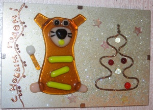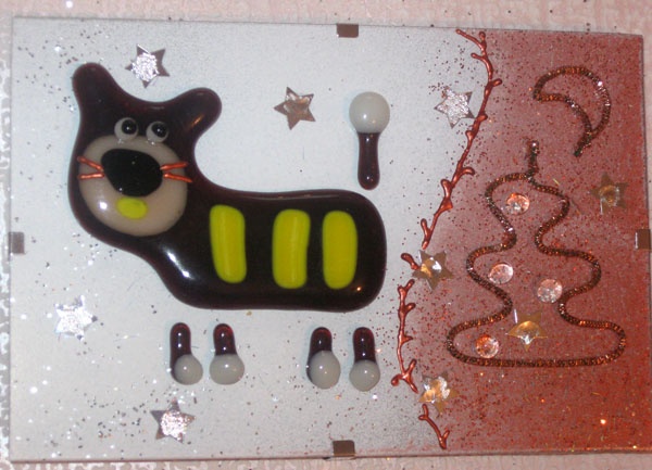 Картинка новогодняя 1. Материалы-фьюзинг, контуры, краски, блестки. Размер 10/15 см.