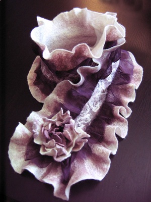 Сделаю на заказ шарфик-волан, свалян из шерсти мериноса. По центру темно-фиолетовый шифон, который в процессе проникновения волокон шерсти сквозь шифон и сваливания, собирается в рюши. Декорирован волокнами шелка и бамбука. Застежка - брошь-цветок, выполнена из той же шерсти.
