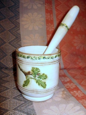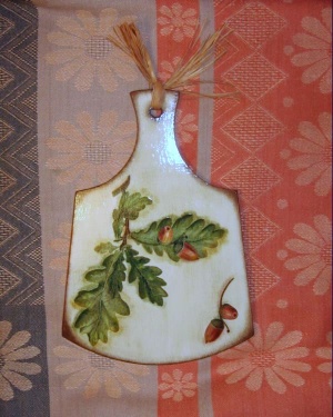 Досочка предназначена для декоративных целей. Ступка – декорирована только снаружи, а внутри можно использовать по назначению. Материал - дерево. Размеры: досочка - высота 20см(вместе с ручкой) х 14см; ступка - высота 9см, диаметр 8см.