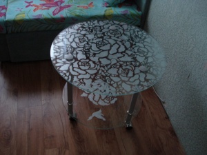 Продам стеклянный столик. Высота 530мм. Размер столешни 600мм, толщина стекла 8мм, нижняя полка - 500мм, 5мм. Ножки на роликах, высота полки регулируется. Ручная роспись на внутренней стороне стола красками по стеклу "серебряный иней".