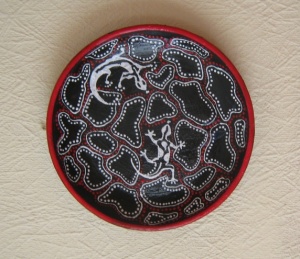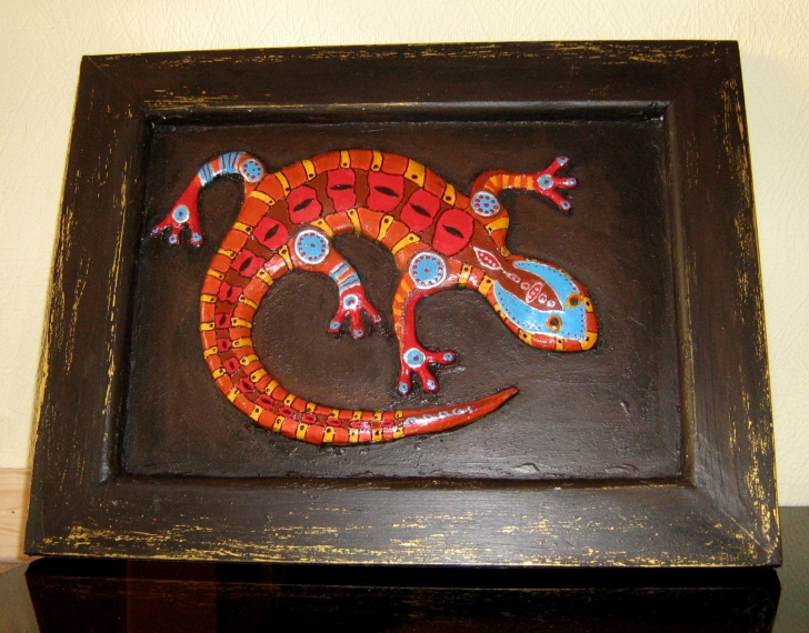Картина с объемной ящерицей. В широкой деревянной раме, рама искусственно состарена под черное дерево с позолотой