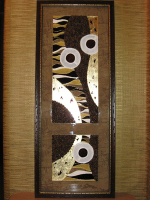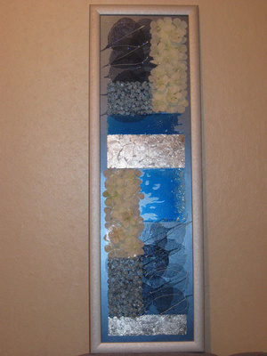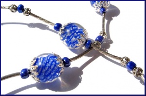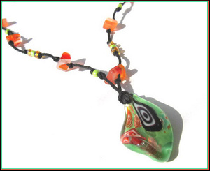 Муранский язычок 2,8 см, в форме листка, слегка спирально скручен. Плюс бисер и рубка какого-то натурального камня в тон. На ближней части кулона, которую плохо видно из-за его изогнутой формы, - красно-белый прямоугольник, повторяющий рисунок черно-белого. Местами - внутреннее золочение.