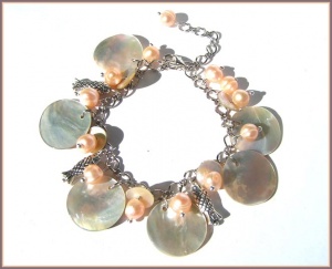 Натуральный речной жемчуг, натуральный перламутр, металлические подвески в форме рыбок. Застегивается в любое звено цепочки, т.е. на любой обхват запястья.