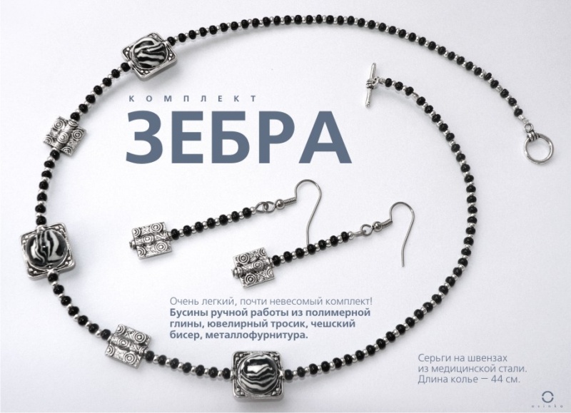 Комплект бижутерии «Зебра» (колье + серьги). Бусины ручной работы из полимерной глины, чешское стекло, ювелирный тросик, металлофурнитура. Серьги на швензах из медицинской стали.