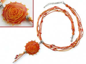 «Солнечный диск». Стеклянная бусина-кулон ручной работы "лэмпворк" (Чехия) на вощеных разноцветных шнурах, бисер, металлофурнитура. Есть аналогичная бусина-солнышко зелено-голубого цвета. Бусина двусторонняя, диаметр около 40 мм.
