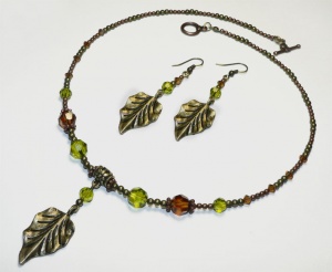 Комплект «Оливки». Колье, серьги. Круглые кристаллы Сваровски (Австрия) размером 8, 6 и 4 мм , цвета Olivine и Smoked Topaz), металлофурнитура бронзового и медного цветов, ювелирный тросик, застежка-тоггл. Длина колье — 45 см. Размер листочков - 30х17 мм.