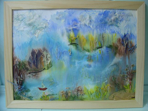 На картине сам фон задал изгиб реки,прозрачность осеннего неба и облики островков.Стояла задача увидеть сюжет,подчеркнуть его материалом и донести до зрителя.Получилась настоящая картина