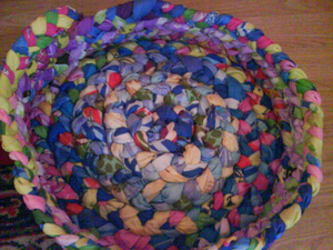 Из готового под рукой только корзинка для кота. По такому же принципу и коврик круглый делаю. Можно и косками короткими сделать (на рабочем фото видно)