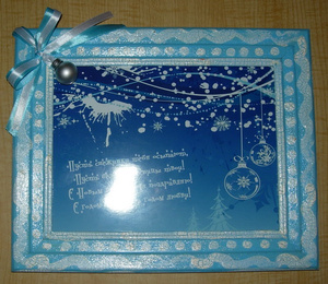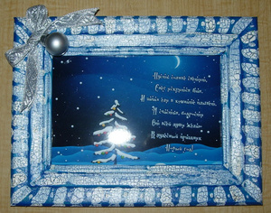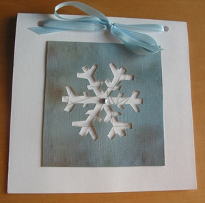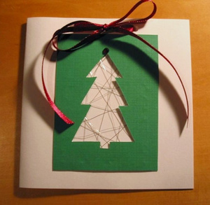 Открытка выполнена с использованием тонкой проволоки, натянутой на прямоугольный картонный каркас. Картинка с вырезанным рисунком клеится сверху на каркас. Я наклеила всю конструкцию на отрыточный картон, украсила снежинку стразинкой, а открытку - отделочной лентой.