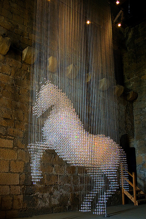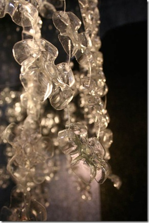 Я уже где-то писала, что как замену дорогостоящим бусинам можно взять кусочки пластиковый бутылок. Берете обычную пластиковую бутылку из-под напитка, желательно цветную - так красивее, режете квадратиками где-то 3х3 см. Далее берете свечку и плоскогубцы. Плоскогубцами захватываете пластиковый квадрат за кончик и держите над огнем. От температуры пластик начинает деформироваться и загибаться. При должном навыке получаются весьма забавные формы. Ну и далее все просто: проделываете отверстия, нанизаете на леску и собираете изделие. Смотрится не хуже штор из бусин, но при этом практически невесомая конструкция, ничего не стоит, да и мусор утилизирован
