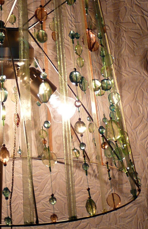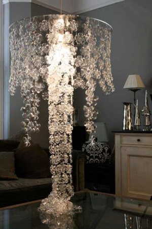 А я абажур на торшер сделала из бусин, а чтобы не так накладно финансово было промежутки между нитей сделала из капроновых лент.