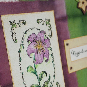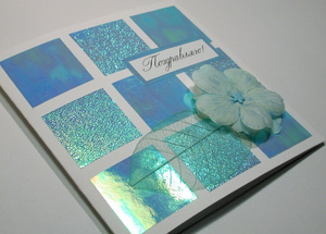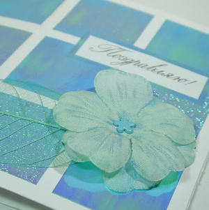 Штамп раскрашенный акварельными карандашами, бумага ручной работы, цветочки собственной вырезки, стразы.
