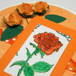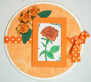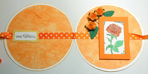Открытка круглая, завязывается спереди на бантик. Раскрашенный акварельными карандашами штамп, розочки Прима, бумага малберри. Внутри открытка без всяких подписей (как большинство у меня).
