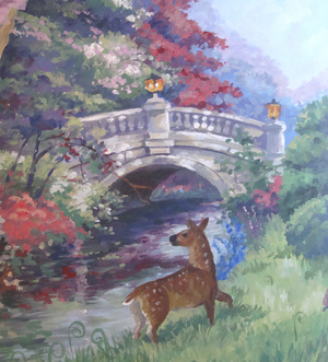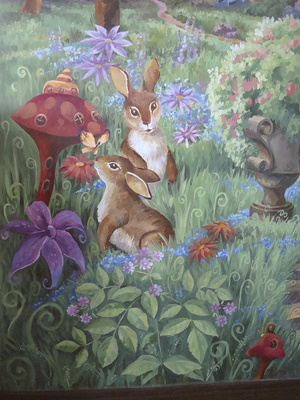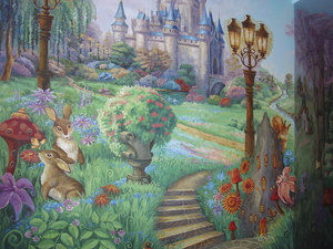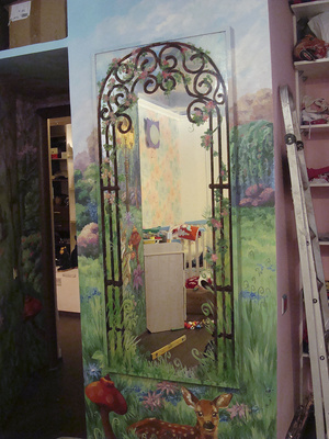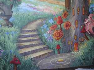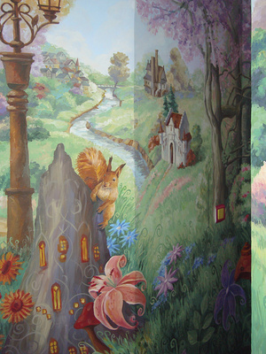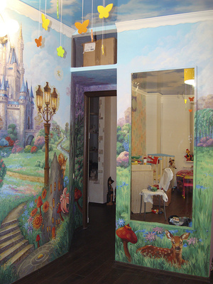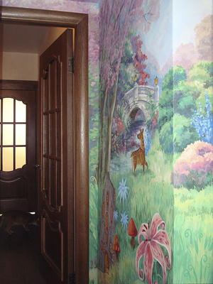 Новый проект "Сказка для Алисы". Роспись на 4х стенах в детской комнате (вход), роспись зеркала... Задача - нарисовать сказку, визуально расширить узкий вход в комнату, "спрятать" зеркало в картине... Целиком нет возможности сфотографировать - поэтому только частями буду выкладывать...