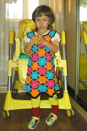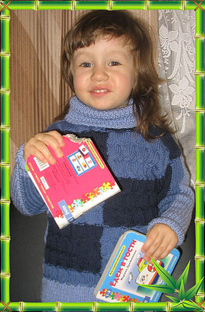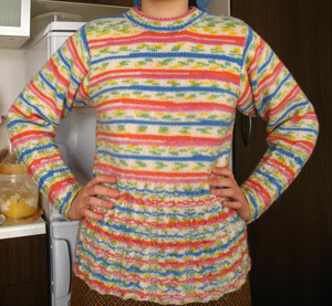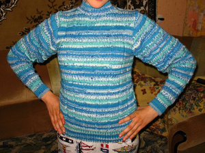 Сейчас довязываю дочери свитерок - вяжу по ширине, впереди буду или замочек вшивать, или сошью и сделаю типа шнуровки. Без боковых швов получается симпатичнее. Себе тунику вообще начала на круговых, но там цвет едино-оранжевый...