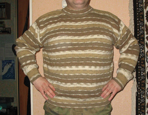 Пряжа в мотках смотана одинаково и вязала я одновременно обе полочки, а потом - оба рукава. Получалось одним цветом (на краях) где-то ряд, где-то три, поэтому на швах совпадений добиться не удалось, а в целом количество и цвета полосок сзади и впереди одинаковое