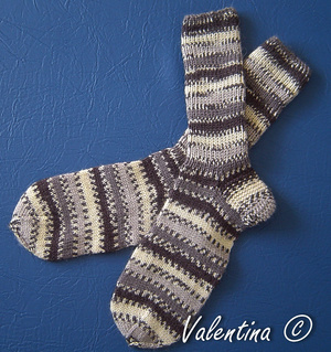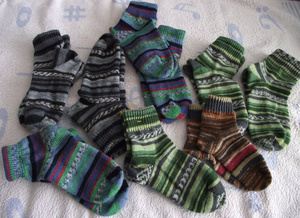 Нашла у себя фото только двух пар, что вязала. Надо поискать где остальные фото, т.к. носков связано ну очень много из этой пряжи :). И расцветки разные и поярче и посдержанне (для мужчин