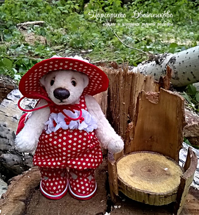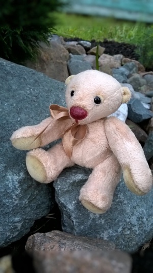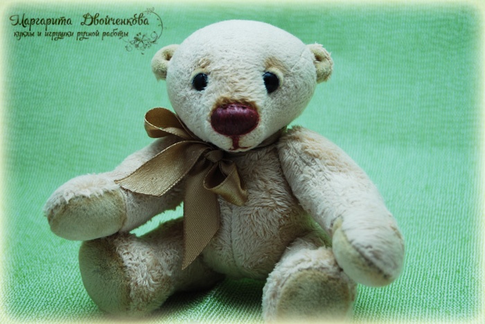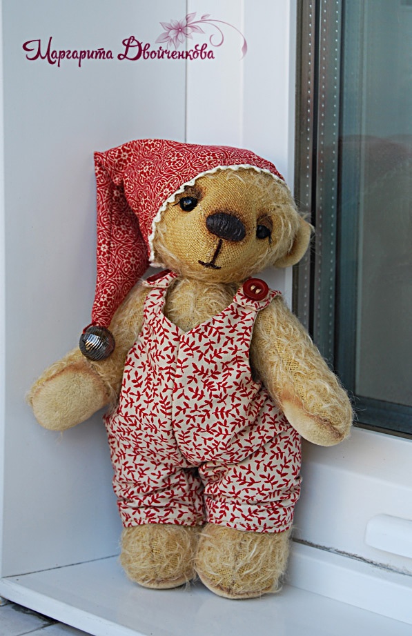 Мишка выполнена из непрофессионального материала на плотной основе с соблюдением всей технологии Тедди, крепления подвижные, 6 шплинтов, глазки стекло, набивка синтепух, утяжелена минеральным гранулятом, стоит самостоятельно, ну и сидит, конечно))). Лёгкая тонировка художественным маслом и текстильным маркером.
